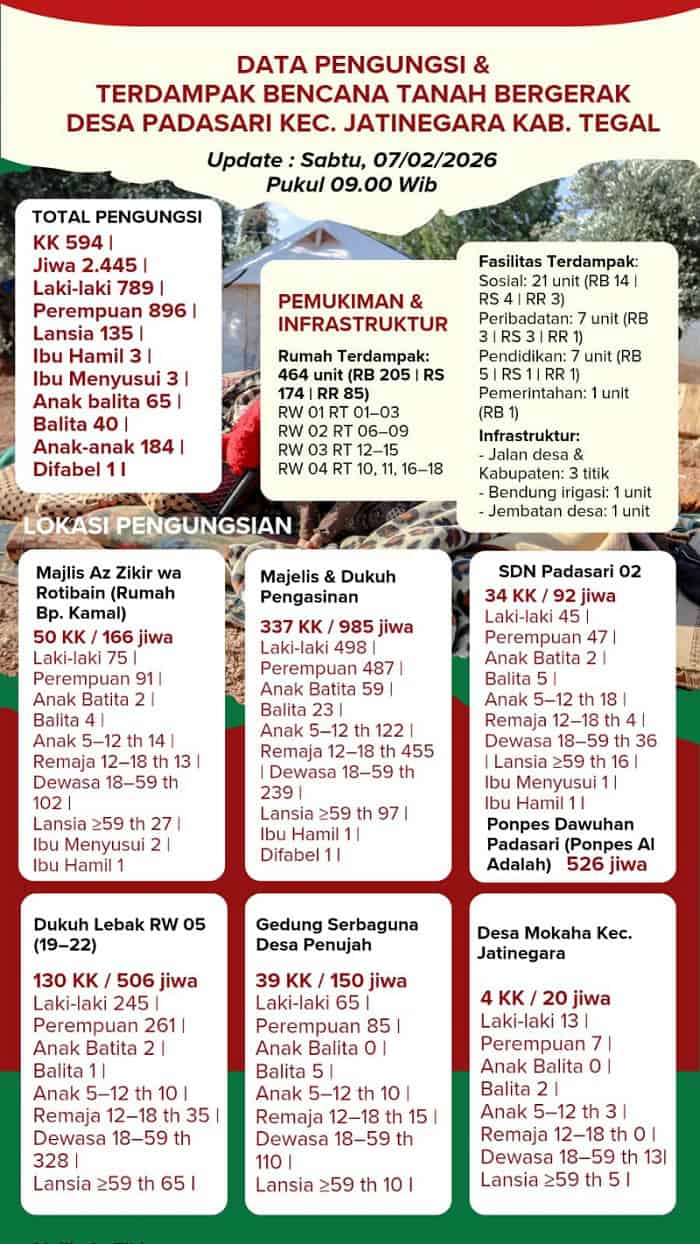 Bencana tanah bergerak yang melanda Desa Padasari, Kecamatan Jatinegara, Kabupaten Tegal, terus menyisakan dampak serius bagi warga. Berdasarkan data pembaruan per Sabtu (7/2/2026) pukul 09.00 WIB, tercatat sebanyak 594 kepala keluarga (KK) atau 2.445 jiwa terdampak dan mengungsi di sejumlah titik.