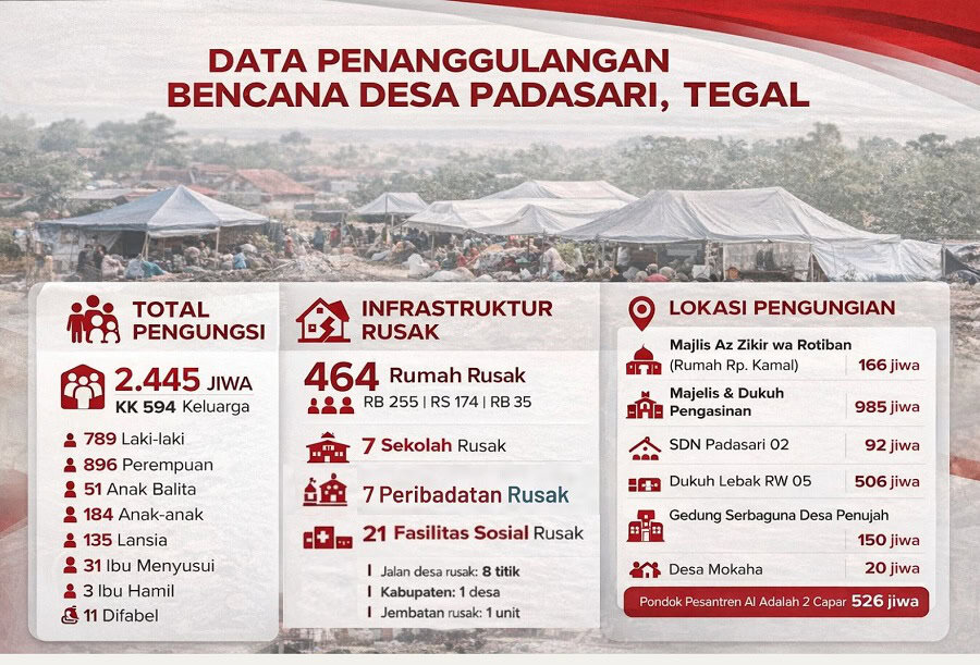 Bencana tanah bergerak yang melanda Desa Padasari, Kecamatan Jatinegara, Kabupaten Tegal, terus menyisakan dampak serius bagi warga. Berdasarkan data pembaruan per Sabtu (7/2/2026) pukul 09.00 WIB, tercatat sebanyak 594 kepala keluarga (KK) atau 2.445 jiwa terdampak dan mengungsi di sejumlah titik.