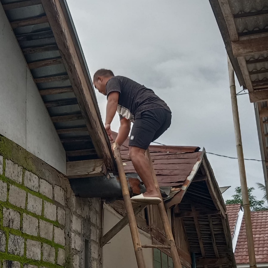 Warga Desa Danasari, Kecamatan Bojong, Kabupaten Tegal, memperbaiki atap rumah yang rusak akibat angin puting beliung pada Rabu, (4/3/2026).