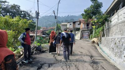 Pengurus BADKO LPQ Kecamatan Bojong meninjau perumahan dan jalan yang terdampak bencana di Padasari pada Sabtu (14/2/2026).