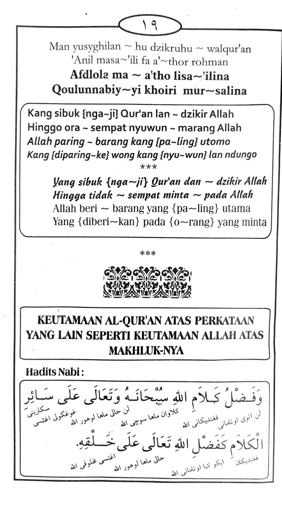 Penjelasan ini seirama dengan syair Jawa yang tertera: “Kang sibuk ngaji Qur’an lan dzikir Allah, hinggo ora sempat nyuwun marang Allah…” yang menekankan totalitas dalam beribadah.