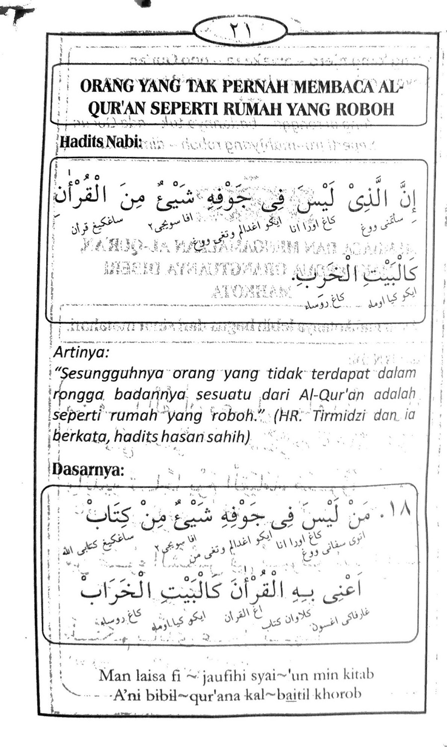 Artinya: “Sesungguhnya orang yang tidak terdapat dalam rongga badannya sesuatu dari Al-Qur’an adalah seperti rumah yang roboh.” (HR. Tirmidzi).
