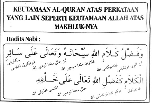 Artinya: “Dan keutamaan Kalam Allah SWT atas perkataan yang lain adalah seperti keutamaan Allah Ta’ala atas makhluk-Nya.” (HR. Tirmidzi).
