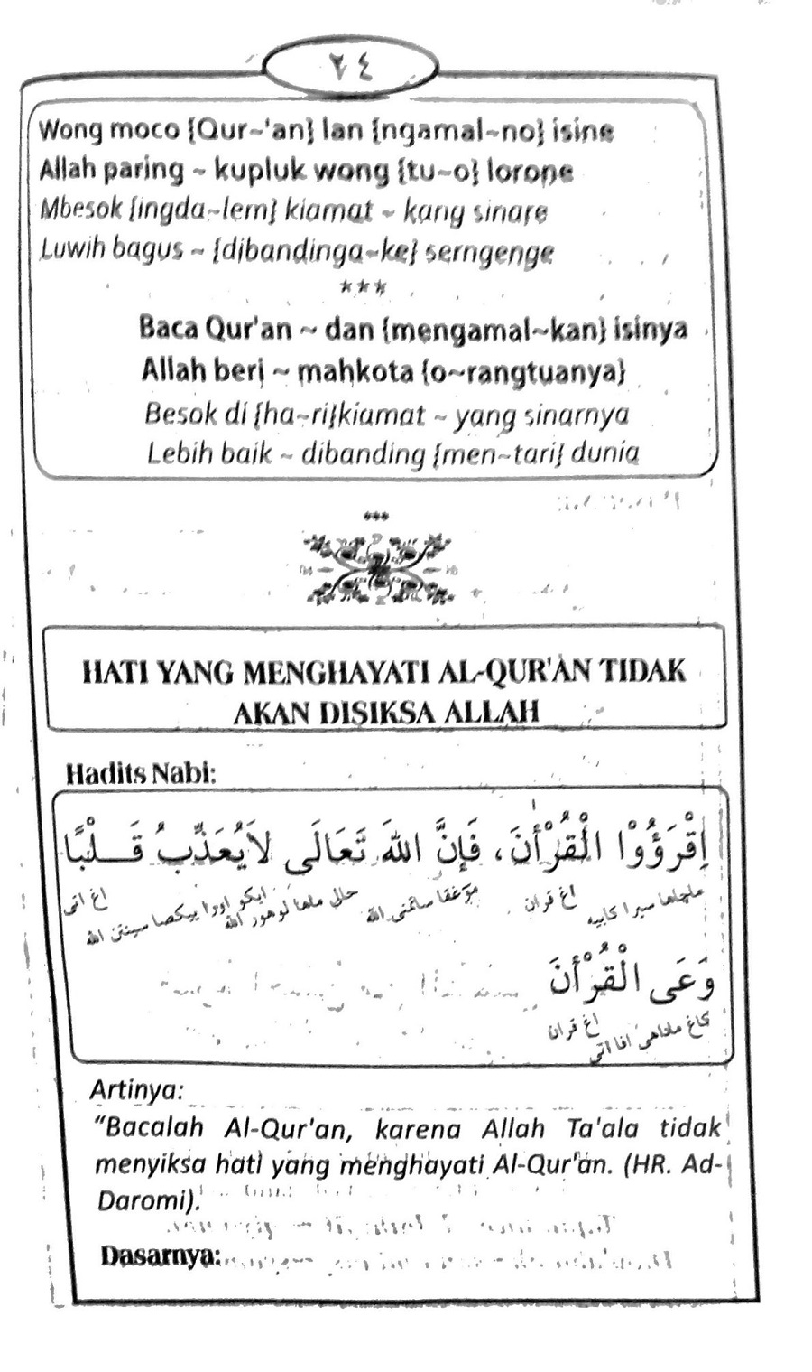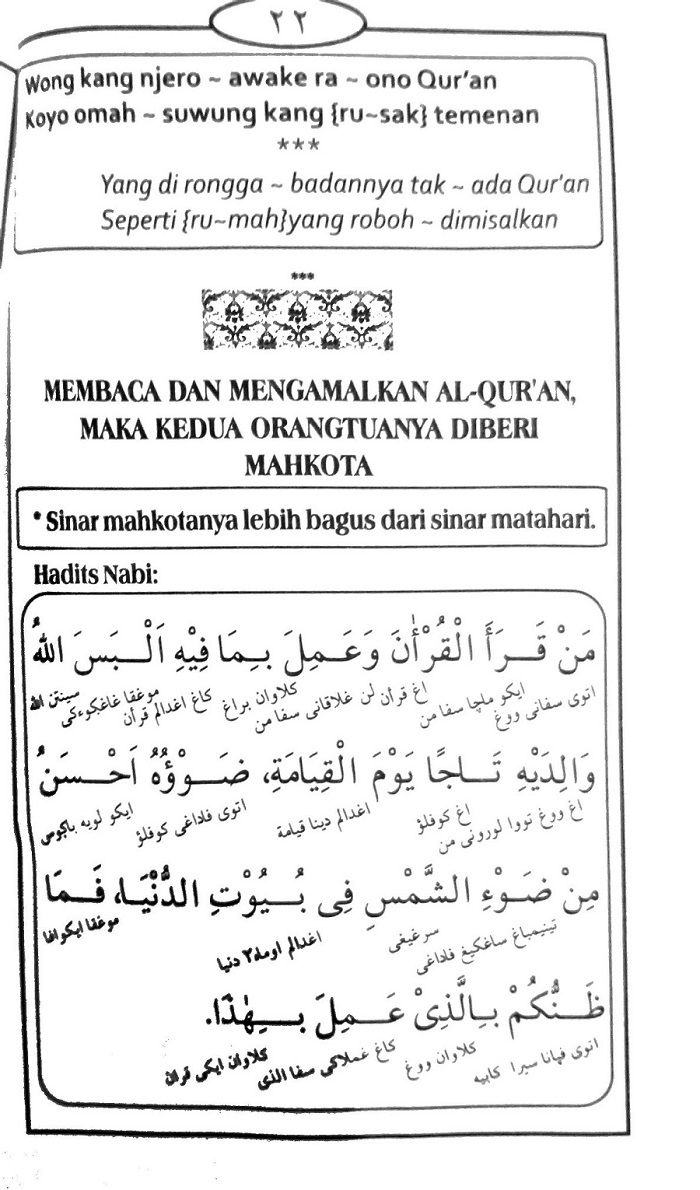 Penjelasan ini mengingatkan kita pada bait syair Jawa dalam gambar tersebut: “Wong moco Qur’an lan ngamalno isine, Allah paring kupluk (mahkota) wong tuo lorone.”