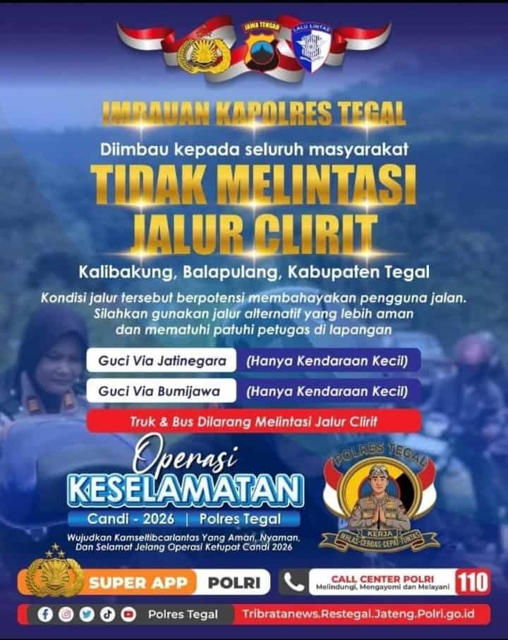 Akibat kondisi tersebut, Polres Tegal mengeluarkan imbauan resmi kepada masyarakat agar tidak melintasi Jalur Clirit demi keselamatan bersama. Imbauan itu juga menjadi bagian dari Operasi Keselamatan Candi 2026.